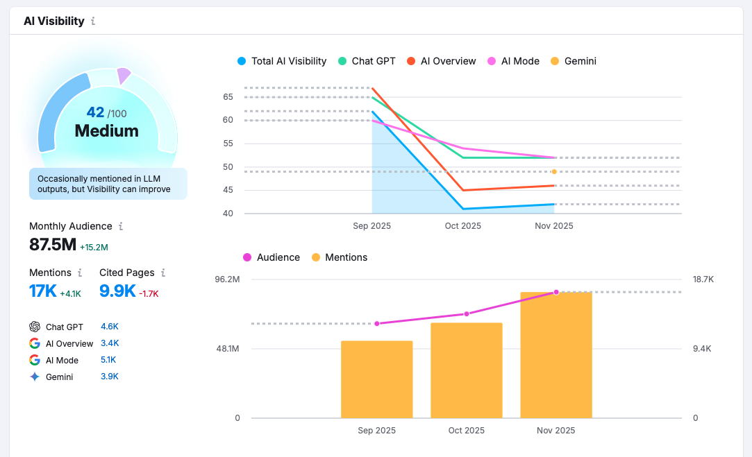 - Your total AI citations – This is the metric that captures your brand’s presence across ChatGPT, AI Overviews, and other generative AI platforms. Popular SEO tools like Ahrefs and Semrush have incorporated AI search metrics, including total AI citations.