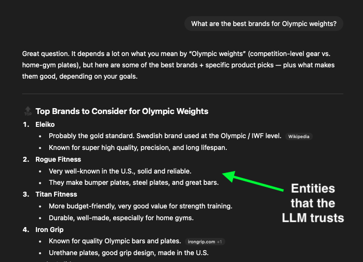 For instance, if a user asks ChatGPT which Olympic weights brand is best, it will recommend the brands (entities) that it considers the highest quality and most trustworthy: