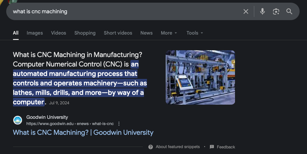 As you can see, it still provides a direct answer to the user query, but it’s a direct quote from Goodwin University and not a synthesized answer. Also, since the Goodwin University result is the only one referenced, it stands to gain all the traffic from the placement.