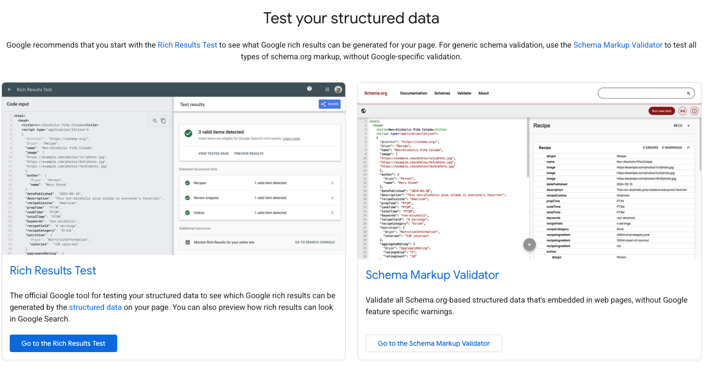 To do so, pull up Google’s Structured Data Testing Tool and run the Rich Results Test and the Schema Markup Validator.